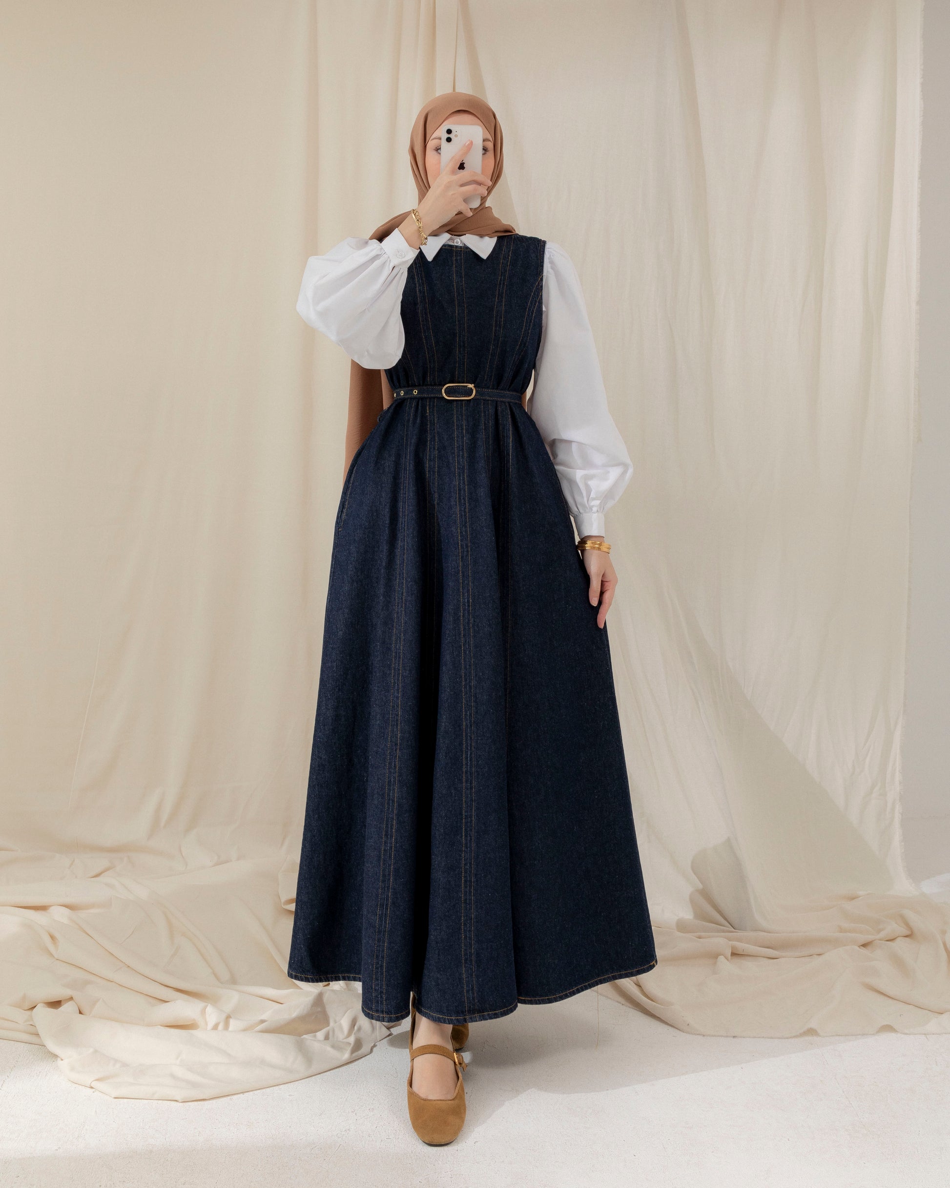 Belted sleeveless denim dress