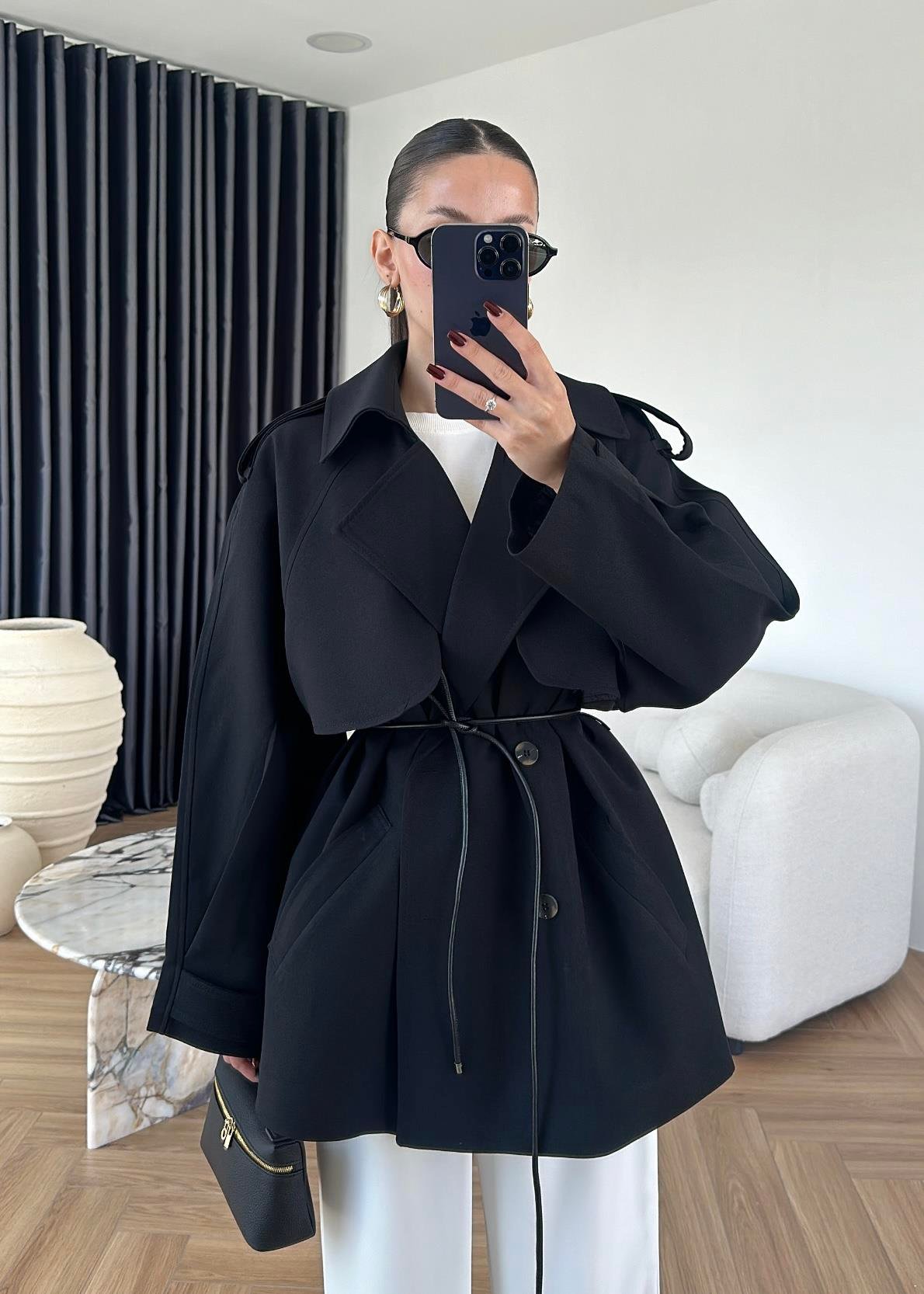 Leather belted trench coat